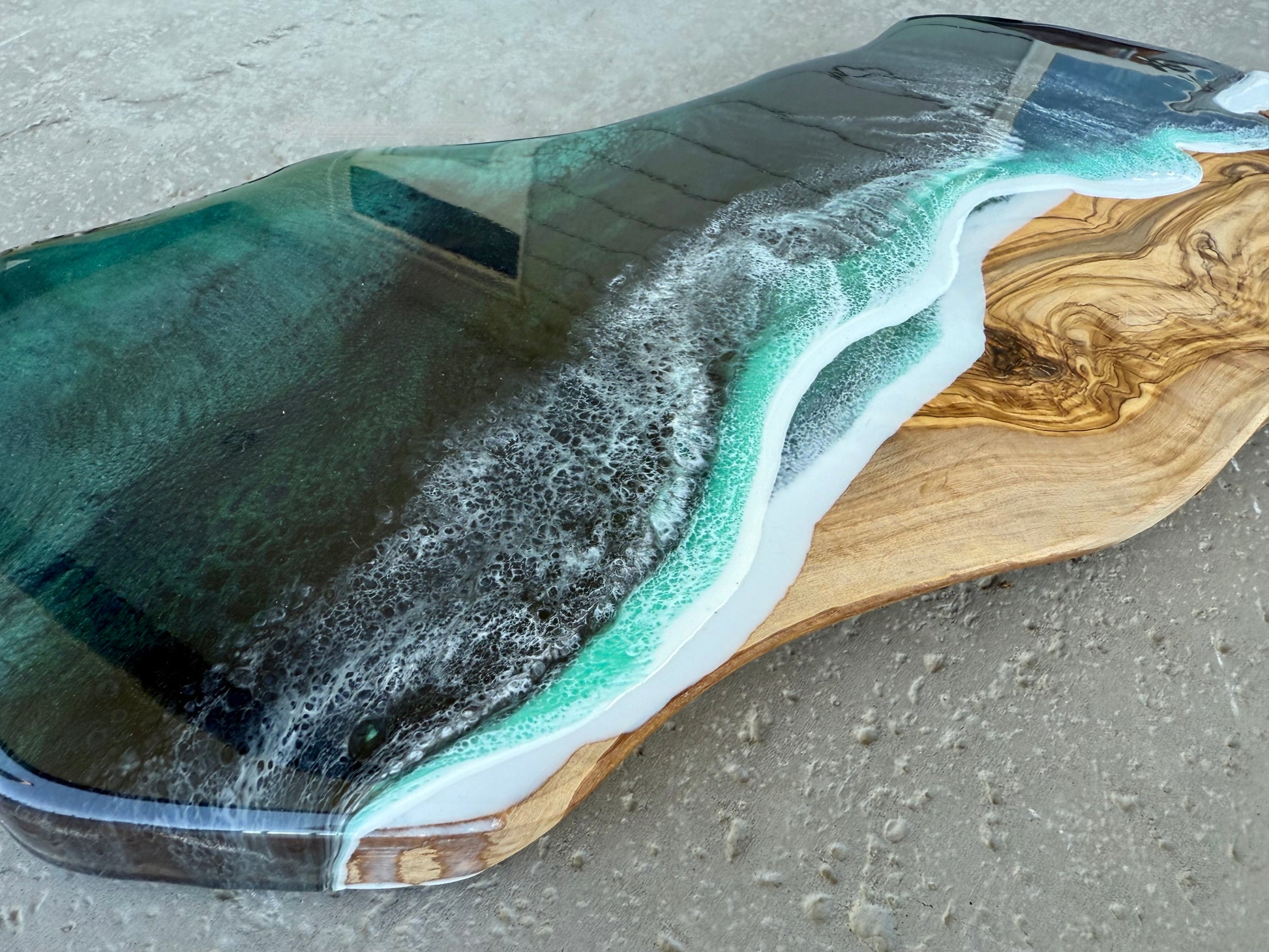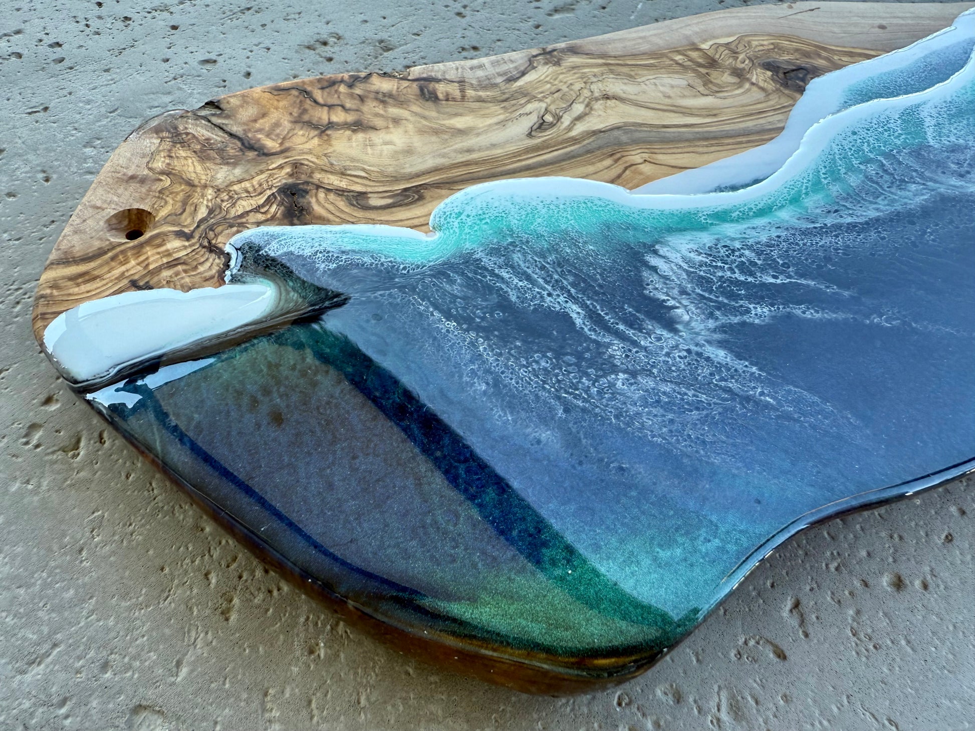 This delightful charcuterie board is crafted from gorgeous olive wood and beautifully accented with resin ocean waves. It's the ideal choice for serving snacks and creating a welcoming atmosphere for guests.